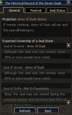 Если проигравшая сторона ранее владела Печатями, то она теряет над ними контроль. Для того, чтобы завладеть силой Печати, победившей стороне необходимо, чтобы 35% и более игроков выигравшей стороны выбрали эту печать. Если выигравшая сторона ранее уже владела какой-либо Печатью, то ей необходимо, чтобы 10% и более игроков победившей стороны выбрали эту Печать. Если выигравшая сторона не набрала достаточное количество %, чтобы получить или сохранить владение силой Печати, то она не может воспользоваться силой этой Печати. Узнать прогноз, кто же станет победителем, и какими Печатями будет владеть, можно в Таблице Прогресса.