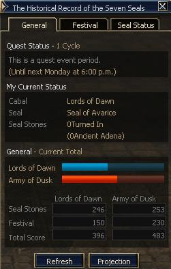 Любой игрок, примкнувший к одной из сторон, может принять участие в Фестивале Тьмы. В разговоре с монахом своей стороны (Priest of Dusk/Dawn) выберите пункт "Participating in the Festival of Darkness", а затем "I wish to go to the Oracle of Dawn/Dusk". После чего Вы будете перенесены в соответствующий Вашей стороне Оракул. Проводятся Фестивали Тьмы только на этапе Борьбы, каждые 20 минут и разделены на 5 классов подобно вещам - по уровню сложности. Смысл Фестиваля Тьмы заключается в том, чтобы набрать наибольший счет за 18 минут, в противостоянии постоянно появляющимся и усиливающимся монстрам. Внутри Оракулов так называемая мирная зона - игроки не могут нападать друг на друга. Также нельзя нападать на ПК. Помимо этого, внутри Оракулов нельзя ставить магазины, но можно обмениваться предметами. Участвовать в Фестивале Тьмы может только группа из 5-9 человек. Группа должна состоять из игроков только одной стороны с разницей в уровнях между собой не более 2. Уровни всех игроков группы должны входить в диапазон уровней, указанный для каждого класса Фестиваля Тьмы. Если персонаж игрока имеет навыки следующей ступени, чем положено иметь игроку на его уровне (делевельнутые игроки), то он не может принимать участие в соревновании. Также у игрока должно быть не более 14 активных квестов и наличие как минимум 20% свободного места в инвентаре. Чтобы принять участие в Фестивале Тьмы, все участники должны внести определенную сумму камней в зависимости от класса Фестиваля. Однако, указанную сумму должен платить только лидер группы. То есть перед началом Фестиваля, игроки должны скинуться камнями Печатей, и отдать всю сумму лидеру. Если у лидера недостаточно камней, то группа не будет допущена к участию в Фестивале. Принимать участие в Фестивалях можно неограниченное количество раз, пока хватает камней, чтобы оплатить взнос участника.